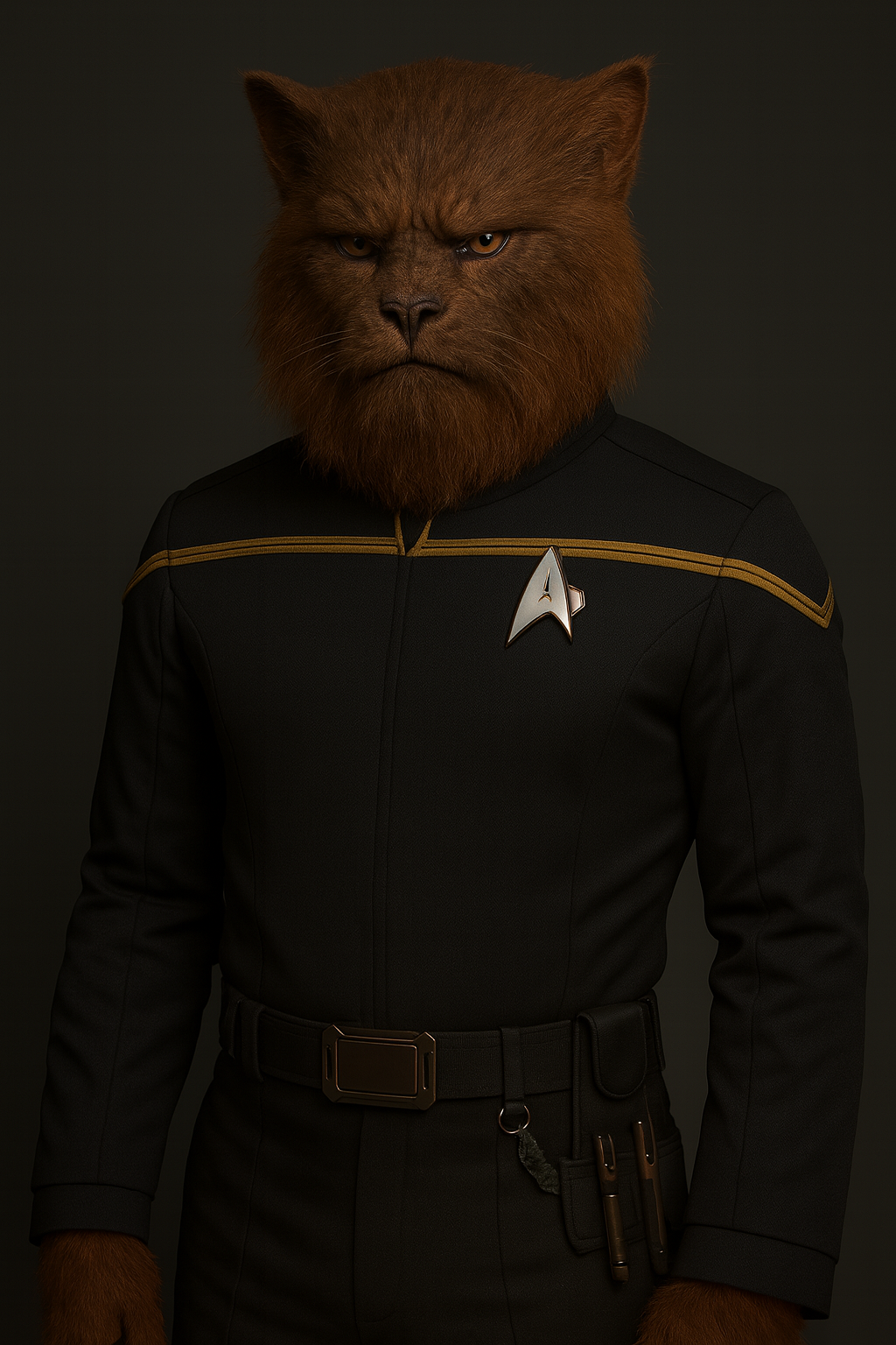 Ka’rel ist ein 36 Jahre alter Caitianer, etwa 2,20 m groß, mit Fell wie dunkler Sand und einer dezenten Mähne, die seinen katzenhaften Kopf rahmt. Seine bernsteinfarbenen Augen wirken aufmerksam und durchdringend, die Ohren bewegen sich oft unbewusst, wenn er Geräusche wahrnimmt. Direkt sichtbar sind sein stets präsenter Werkzeuggürtel und die hochgekrempelten Ärmel seiner Technik-Uniform. Der erste Eindruck: ein bodenständiger, erfahrener Maschinist mit Instinkt – halb Philosoph, halb Handwerker.Lebenslauf